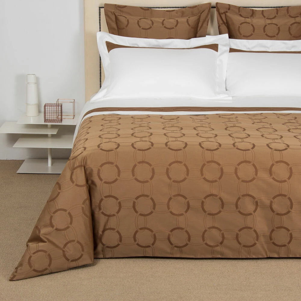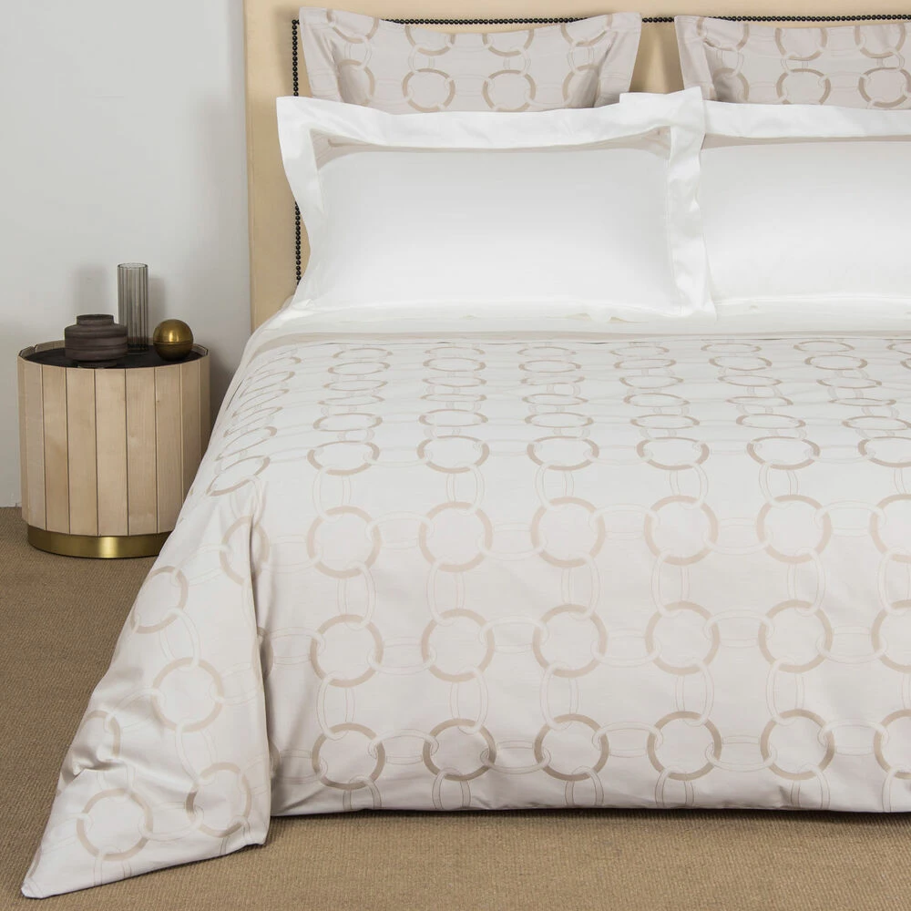 Turn your bedroom into an inviting sanctuary with the Chains duvet cover. While the upper side of the duvet is adorned with exquisite detail, the under side is constructed of the softest, purest cotton sateen that might persuade you to stay in bed a few minutes past your alarm. Crafted with exceptional care, the entire Chains collection defines opulence. Pure extra long staple cotton. Made in Italy. A classic style re-envisioned with modern details, our Chains duvet cover has an irresistible elegance you will cherish in your bedroom. The bold, intricate design is perfectly complemented by soft, neutral hues, establishing a sense of placidity with a subtle dose of flair.