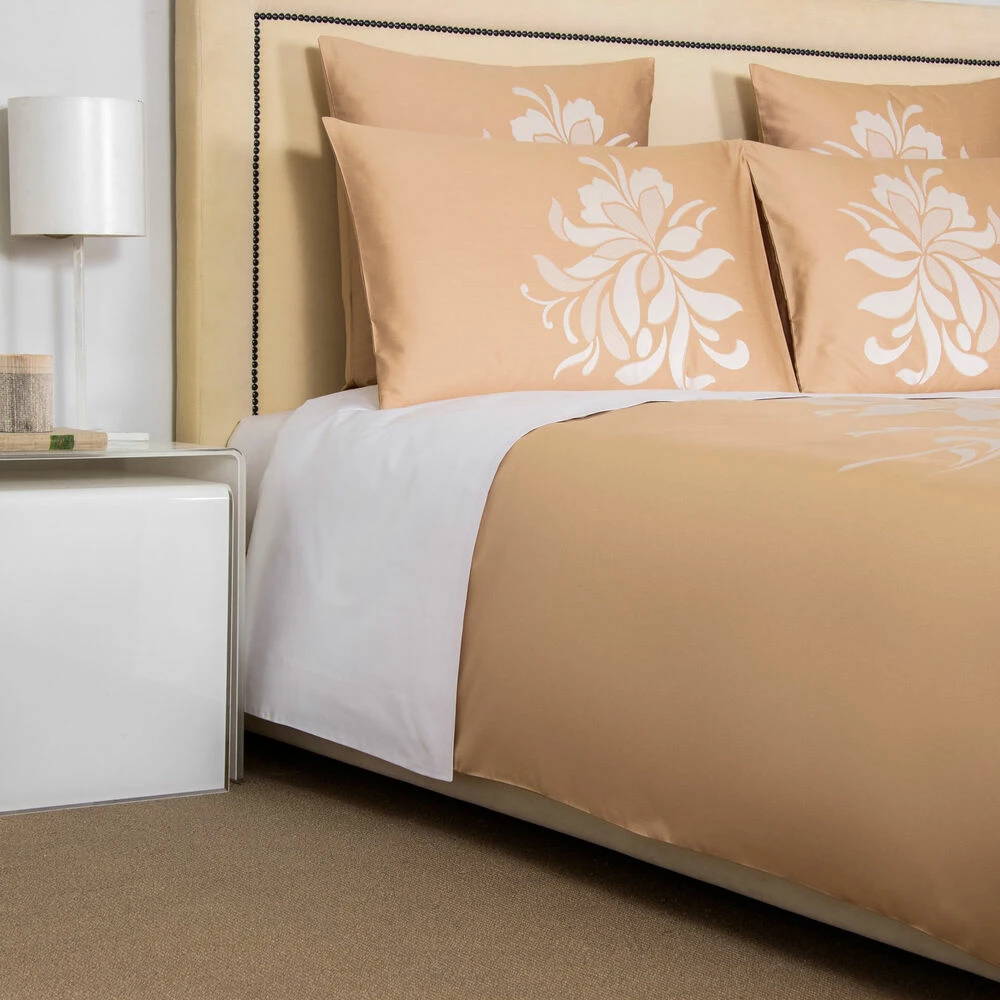 Like a royal emblem, the grand lotus motif is a sophisticated statement for an elegant bedroom. The Lotus Flower Duvet Cover in pure long-staple cotton sateen brings regal comfort to any room. Pure extra long staple cotton. Made in Italy. The Lotus Flower Duvet Cover features an intricately crafted lotus jacquard carefully woven on a uniquely oversized loom on soft and silky cotton sateen.