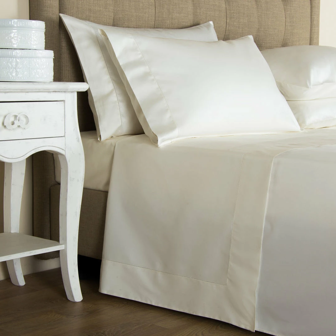 A sheet set featuring a top sheet and two pillowcases embellished with Frette’s signature open hemstitched on crisp cotton percale. The sheet set includes a top sheet, two pillowcases, and a fitted bottom sheet. 100% cotton. Made in Portugal. **Please note cotton percale has a crisp, cool feel, and does not have the silky soft hand of cotton sateen. If you prefer silky soft sheets, we recommend cotton sateen.** Crafted from cool crisp cotton percale, the Lux Percalle Sheet Set features our signature open hemstitch for a timeless finish.
