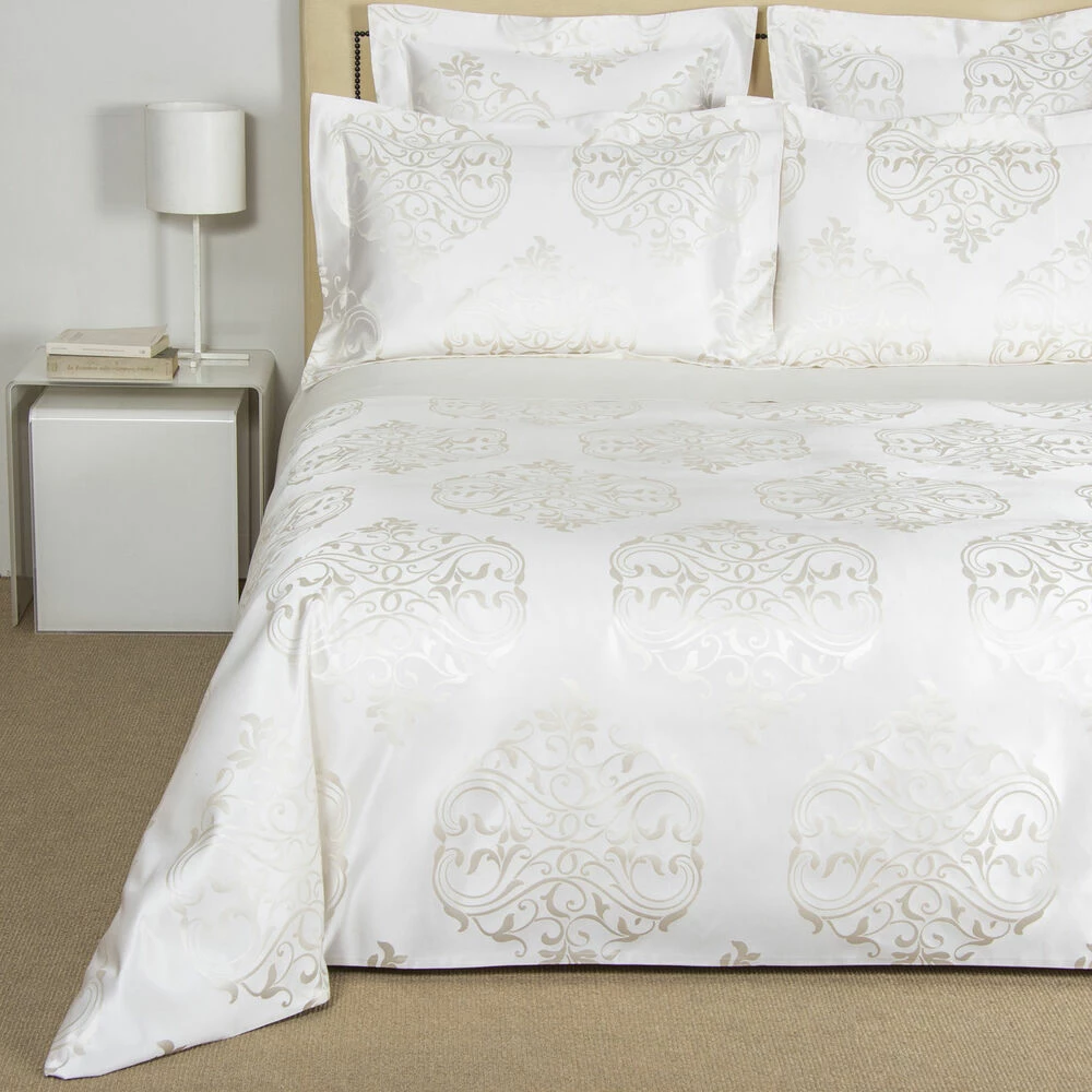 Soft to the touch, the Luxury Ornate Medallion Duvet Cover in soft and silky long-staple cotton sateen brings regal comfort to any bedroom. Combine this elegant duvet cover with the coordinating bedspread or mix with other classic styles for a modern look. 61% Silk, 39% Cotton. Made in Italy. Crafted with pure cotton sateen and featuring a romantic arabesque jacquard, the Luxury Ornate Medallion Duvet Cover is intricate yet modern, the perfect blend of classic styling and contemporary design.