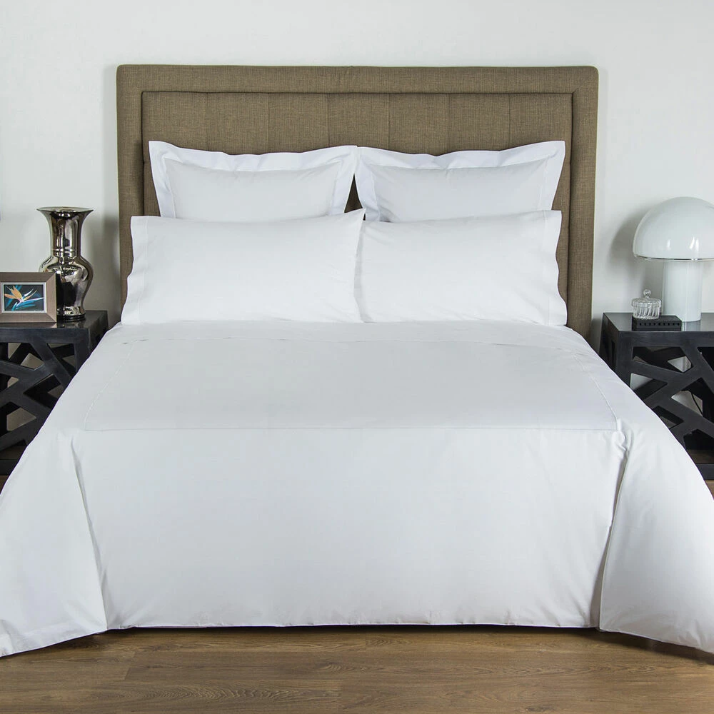 A duvet cover embellished with a distinctive one-line embroidery on crisp cotton percale. 100% cotton.**Please note cotton percale has a crisp, cool feel, and does not have the silky soft hand of cotton sateen. If you prefer silky soft sheets, we recommend cotton sateen.** A duvet cover embellished with a distinctive one-line embroidery on crisp cotton percale.