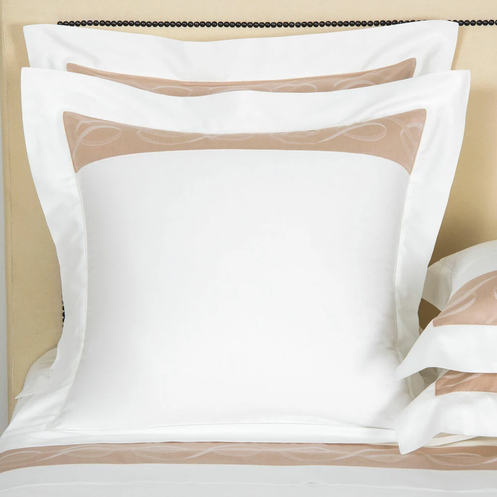 These standard shams are crafted with warm, silky cotton sateen that feels exceptionally soft against the skin. The refined ribbon-patterned border appears across the top of the upper side. Layer your Ribbons Border standard sham with our Lozenge light quilt for a look that is warm and inviting, or try something more dramatic and regal with a matching Luxury Fox blanket. Either way, this sham is the epitome of luxury, and the exceptional craftsmanship is apparent in the yarn dyed cotton sateen jacquard design. Leave your door open for guests to peer in, or create your own private haven. Pure extra long staple cotton. Made in Italy. Sophisticated and elegant, the Ribbons Border standard sham brings a touch of elegance and refinement to your bedroom. The charming, flowing design and soft, natural hues will enhance the tranquillity of the room, allowing you to fall asleep with ease.