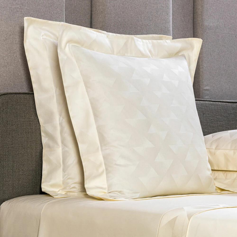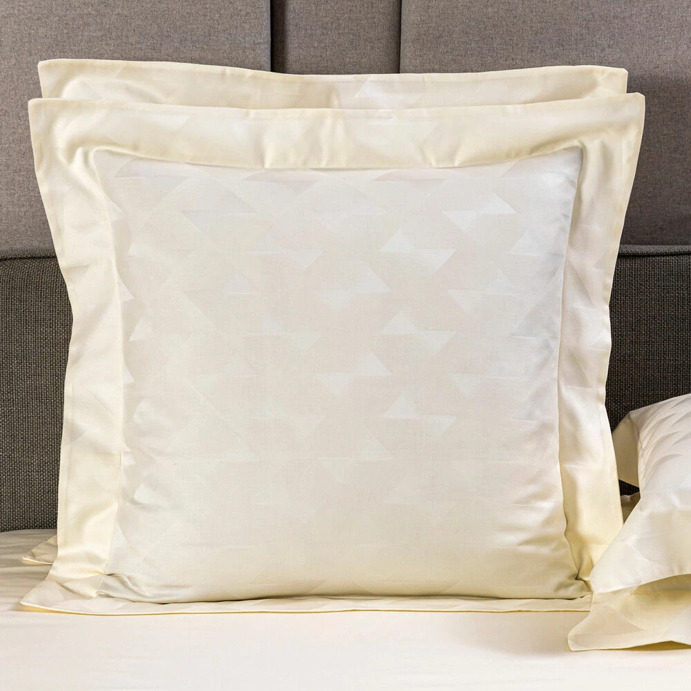 The Tecla Euro Sham is woven with a geometric jacquard on the front and finished with a solid sateen panel on the back. Pair with the coordinating Tecla Duvet Cover to complete the look. Pure cotton. Does not include a filler. Made in Italy. Featuring a mirrored geometric block design, Tecla introduces an element of movement that is both subtle and captivating.