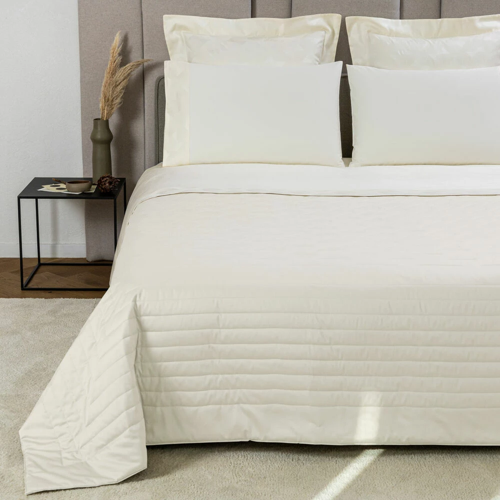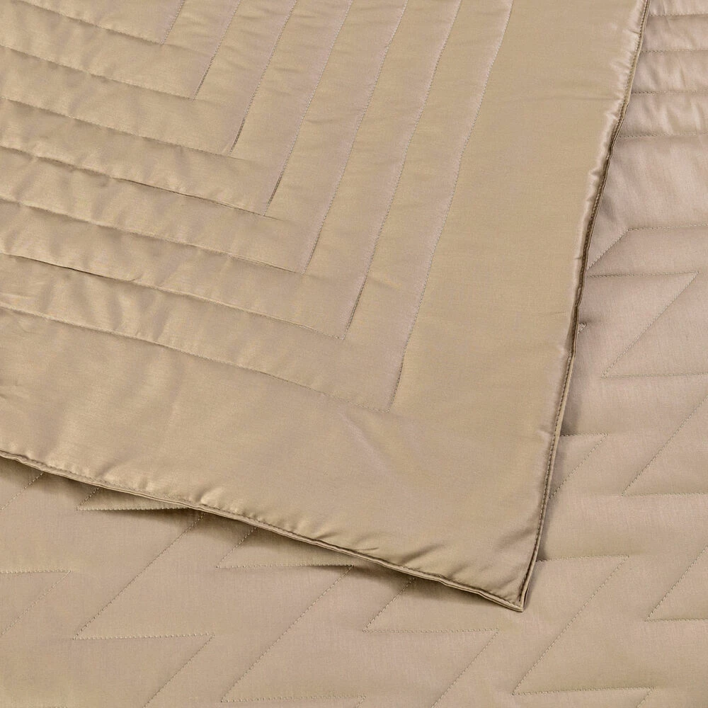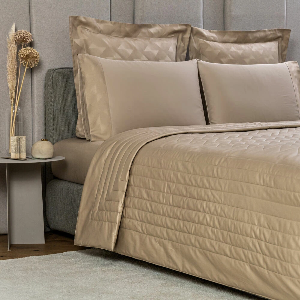 The Tecla Light Quilt is woven with a geometric jacquard on the front and finished with a solid sateen panel on the back. Pair with the coordinating Tecla Duvet Cover to complete the look. Pure cotton. Made in Italy. Featuring a mirrored geometric block design, Tecla introduces an element of movement that is both subtle and captivating.